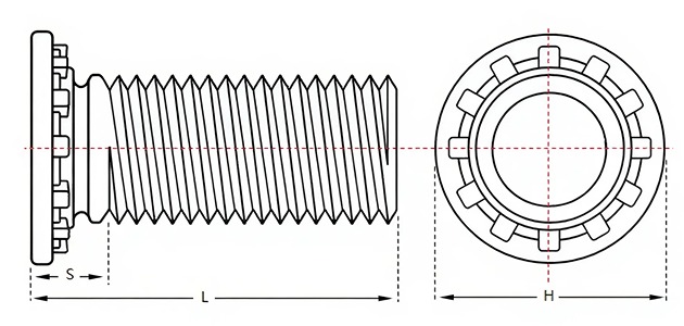 这是一种通过压铆工艺安装在薄板上的紧固件,在钣金上加工一个特定尺寸的圆孔,将螺钉放入预制孔中,使用压铆机配以专用的平底模具,对螺钉头部施加压力,螺钉被永久固定在板上,形成一个可靠的外螺纹连接点