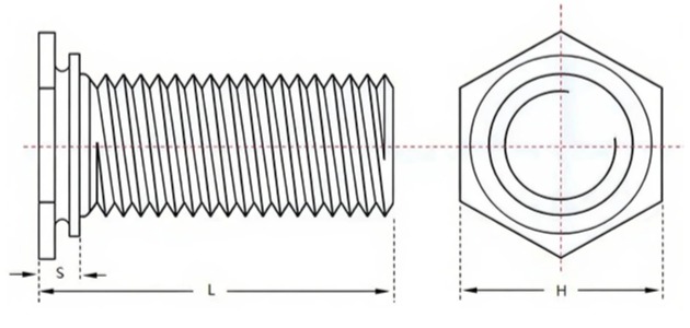 这是一种通过压铆工艺安装在薄板上的紧固件,在钣金上加工一个特定尺寸的圆孔,将螺钉放入预制孔中,使用压铆机配以专用的平底模具,对螺钉头部施加压力,螺钉被永久固定在板上,形成一个可靠的外螺纹连接点。此款压铆件头部为六角头。